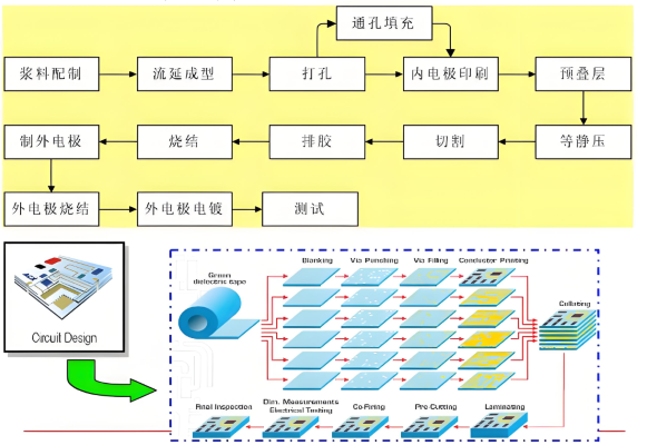 এর মূল প্রক্রিয়াএলটিসিসিপ্রযুক্তিটি নিম্নরূপ: প্রথমত, সিরামিক পাউডার, গ্লাস পাউডার এবং জৈব বাইন্ডারগুলি মিশ্রিত করা হয় এবং তারপরে টেপ কাস্টিং, শুকনো এবং অন্যান্য প্রক্রিয়াগুলির মাধ্যমে সুনির্দিষ্ট বেধ এবং ঘন কাঠামোর সাথে সবুজ সিরামিক টেপগুলিতে প্রক্রিয়া করা হয়। পরবর্তীকালে, প্রয়োজনীয় সার্কিট নিদর্শনগুলি লেজার ড্রিলিং, মাইক্রো-হোল গ্রাউটিং এবং যথার্থ কন্ডাক্টর পেস্ট প্রিন্টিংয়ের মতো প্রযুক্তি ব্যবহার করে সবুজ সিরামিক টেপগুলিতে বানোয়াট হয়। এরপরে, একাধিক প্রক্রিয়াজাত সবুজ সিরামিক টেপগুলি স্তরিত এবং সংহত হয় এবং 900 ডিগ্রি সেন্টিগ্রেডের নীচে নিম্ন-তাপমাত্রার পরিবেশে সিন্টার করা হয়। অবশেষে, চিপ ডিভাইসগুলি উত্পাদন করা যেতে পারে; এটি একক ত্রি-মাত্রিক সিরামিক মাল্টিলেয়ার সার্কিট সাবস্ট্রেট গঠনের জন্য একাধিক প্যাসিভ উপাদানগুলি এম্বেড করতে পারে; এছাড়াও, প্যাসিভ/অ্যাক্টিভ ইন্টিগ্রেটেড ফাংশনাল মডিউলগুলি তৈরি করতে আইসিএস এবং সক্রিয় ডিভাইসগুলি তার পৃষ্ঠে মাউন্ট করা যেতে পারে। এই প্রযুক্তিটি সার্কিটগুলির মিনিয়েচারাইজেশন এবং উচ্চ ঘনত্বকে আরও প্রচার করতে পারে এবং উচ্চ-ফ্রিকোয়েন্সি যোগাযোগ ক্ষেত্রে উপাদানগুলি তৈরির জন্য বিশেষভাবে উপযুক্ত।